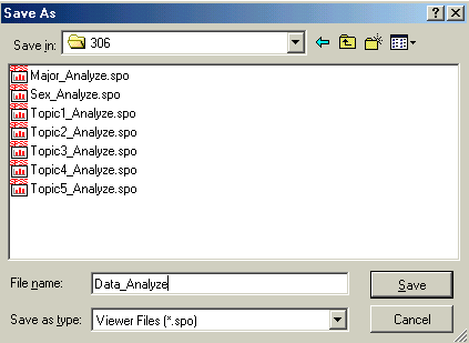 ในช่อง Save in กำหนดสถานที่จัดเก็บ และในช่อง File name ให้กำหนดชื่อ file ข้อมูล ท้ายนี้ท่านสามารถนำผลที่ได้จากการวิเคราะห์ข้อมูลทางสถิติ ไปแปลงผลเป็นข้อมูลเชิงบรรยาย เพื่อประกอบการวิจัยหรือตามวัตถุประสงค์การวิเคราะห์นั้นๆ ของท่าน อย่างไรก็ตามขอเน้นยำว่าท่านจะจำเป็นต้องมีพื้นฐานความรู้ด้านสถิติเบื้องต้นมาก่อน จึงจะสามารถแปลงผลการวิเคราะห์ได้อย่างถูกต้องและเข้าใจ ที่มา http://www.thaiwbi.com/course/Spss_for_Windows/index2.html